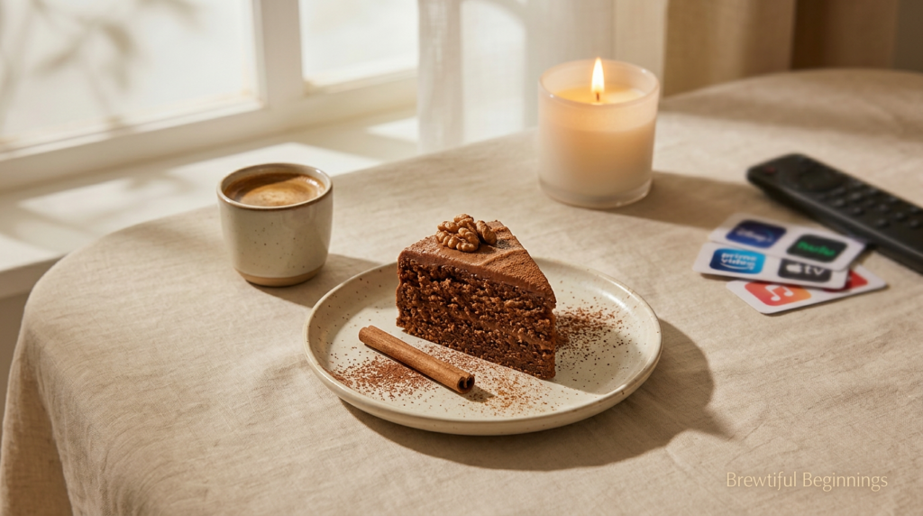 At Brewtiful Beginnings, the best recipes are the ones that tell a story. Chocolate Spice Cake is not just about baking — it’s about the whole feeling around it. The scent of coffee, the glow of a lamp, a soft blanket nearby, and a watchlist that makes you want to stay in a little longer.
